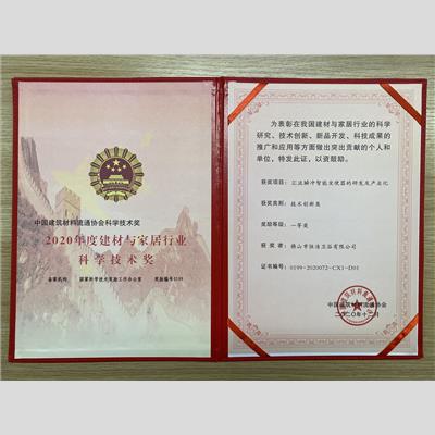 獎 項:2020年度建材與家居行業-科學技術獎 技術創新類一等獎-佛山恒潔